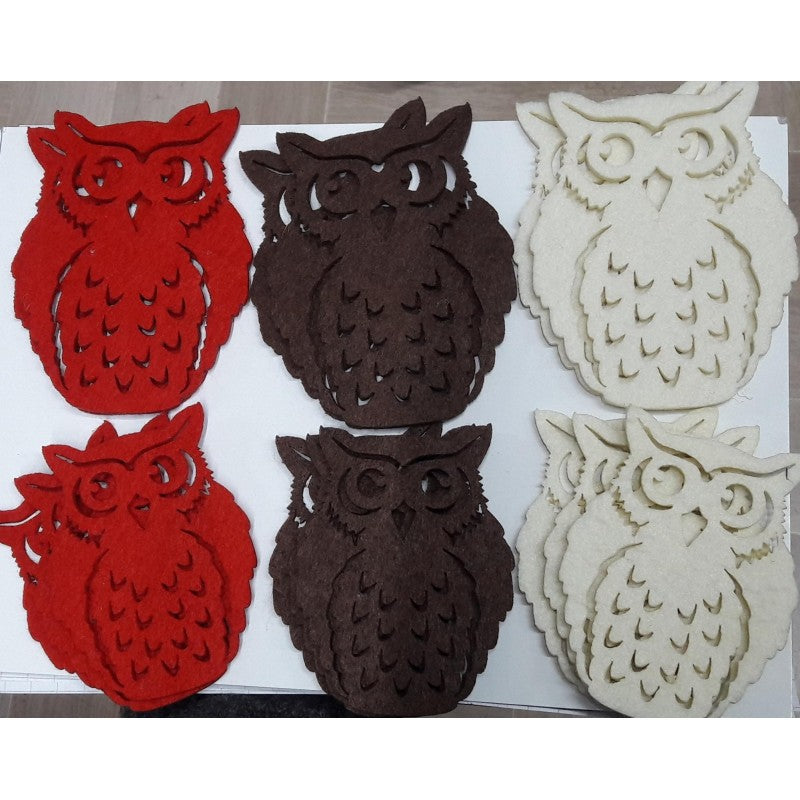 Set 15 gufetti in felto, colori e misure assortite: 2 gufi grandi rossi, 2 gufi grandi marroni, 2 gufi grandi panna, 3 gufi piccoli rossi, 3 gufi piccoli marroni, 3 gufi piccoli panna.