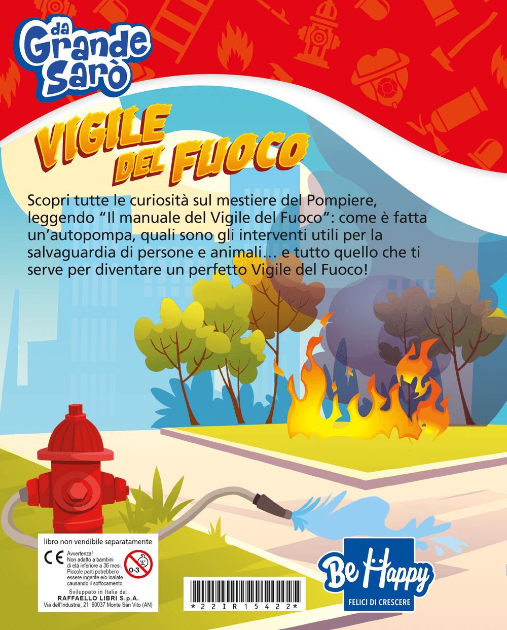 - Un libro illustrato di 24 pagine: Scopri tutte le curiosità sul mestiere del pompiere, come funziona un'autopompa e quali sono gli interventi per salvare persone e animali.