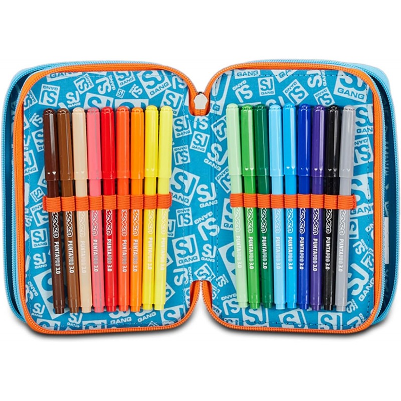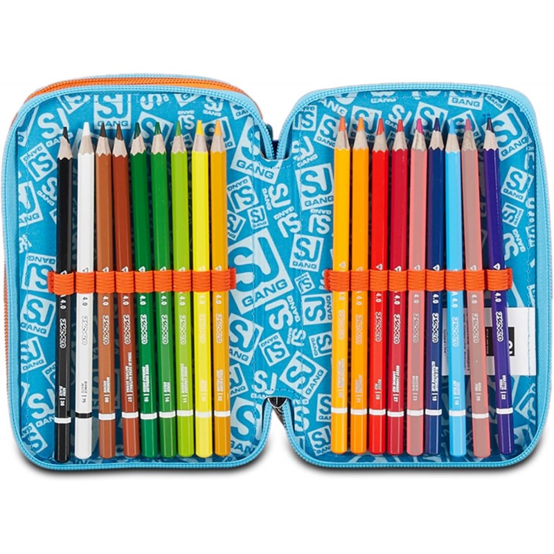 Ciao! Sono il coloratissimo Astuccio 3 zip SJ Gang. Dotato di 3 scomparti completi di tutto il materiale necessario per fare al meglio i tuoi lavori di scuola, puoi abbinarmi a uno zaino o a un trolley SJ Gang.