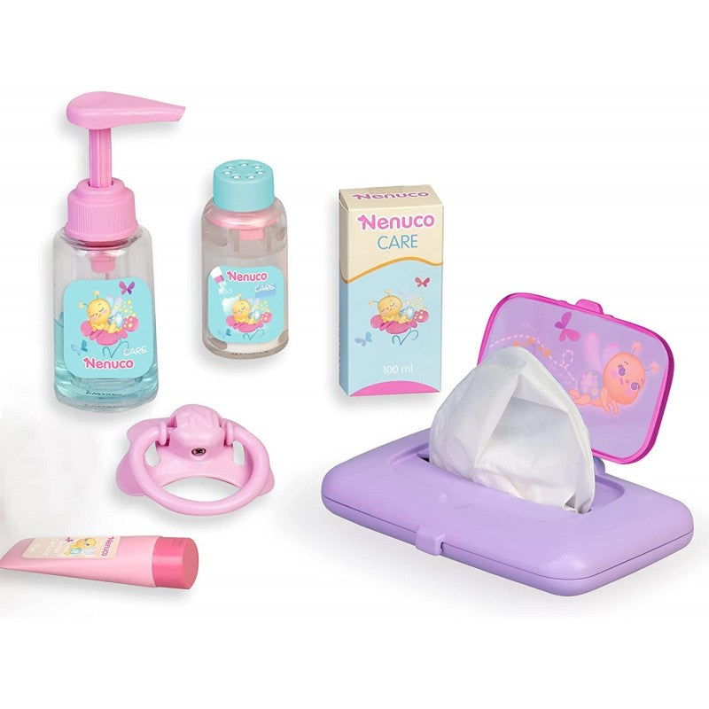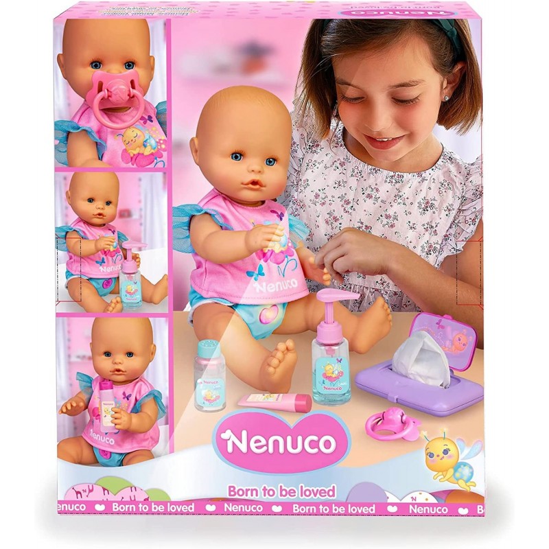 La nostra Bambola Nenuco Pannolino Magico include accessori per prendersi cura del bambino, come salviettine, talco, crema e sapone. Inoltre, la bambina/o può utilizzare il ciuccio per confortare il bambino.