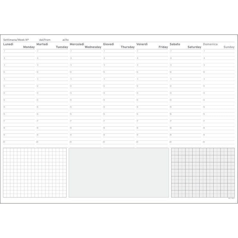 Blocco da tavolo settimanale non datato con domenica intera. Ampio spazio di scrittura per questo planner in carta bianca, con spirale e copertina sintetica. Multilingue Italiano-Inglese.