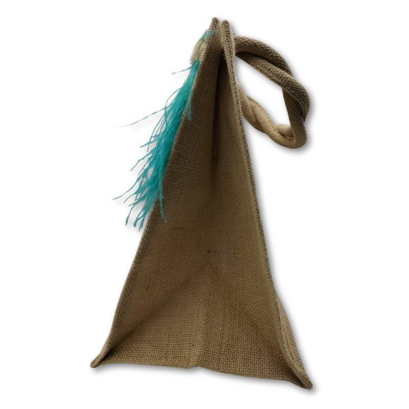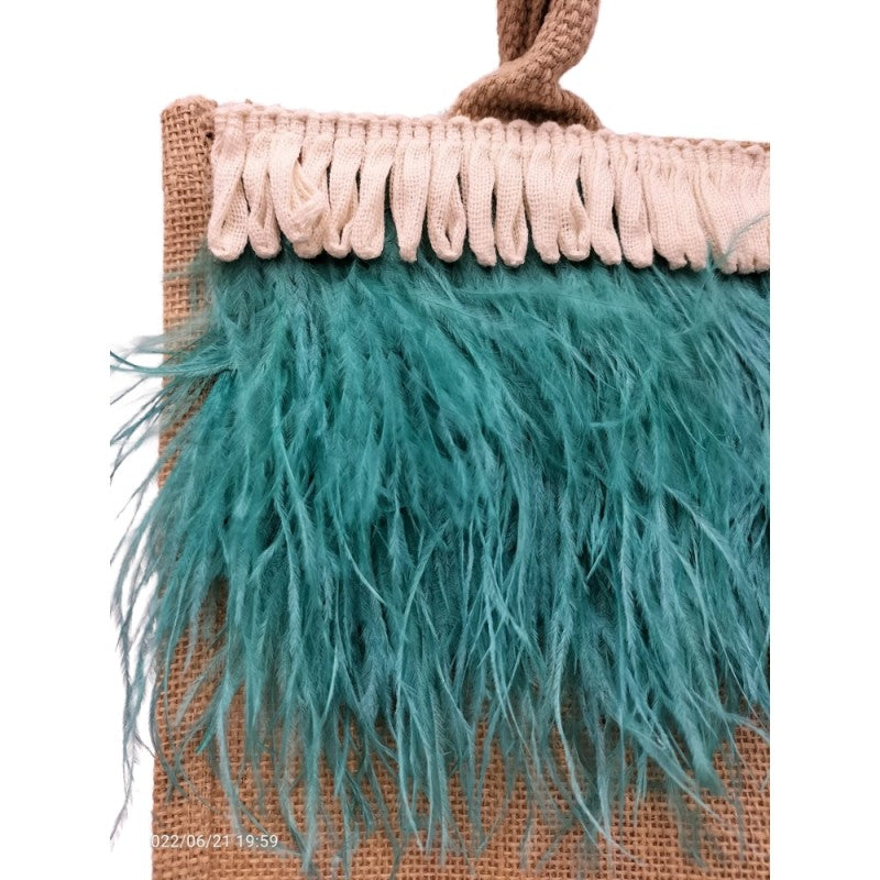 Borsa In Juta Realizzata A Mano Decorata Con Piume Azzurre