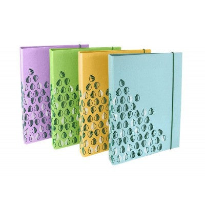 Cartelle a 4 anelli diam. 25 mm in robusto cartone con rivestimento in carta paglia sia internamente che esternamente. Pratico elastico di chiusura in tinta con il colore della cartella. Disponibile in 4 colori assortiti (verde, lilla, giallo, celeste). Formato utile 31x22 cm.