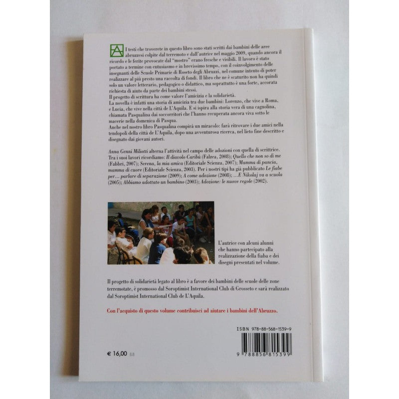 I testi che troverete in questo libro sono stati scritti dai bambini delle aree abruzzesi colpite dal terremoto e dall'autrice nel maggio 2009, quando ancora il ricordo e le ferite provocate dal "mostro" erano fresche e visibili. Il lavoro è stato portato a termine con entusiasmo e in brevissimo tempo, con il coinvolgimento delle insegnanti delle scuole primarie di Roseto degli Abruzzi, nel comune intento di poter realizzare al più presto una raccolta di fondi. Il libro che ne è scaturito non ha quindi solo un valore letterario, pedagogico o didattico, ma soprattutto è una forte, accorata richiesta di aiuto da parte dei bambini stessi. Il progetto di scrittura ha come valore l'amicizia e la solidarietà. La novella è infatti una storia di amicizia tra due bambini: Lorenzo, che vive a Roma, e Lucia, che vive nella città de L'Aquila. E si ispira alla storia vera di una cagnolina, chiamata Pasqualina dai soccorritori che l'hanno recuperata ancora viva sotto le macerie, nella domenica di Pasqua. Anche nel nostro libro Pasqualina compirà un miracolo: farà ritrovare i due amici nella tendopoli della città de L'Aquila, dopo una avventurosa ricerca, nel lieto fine descritto e disegnato dai giovani autori.