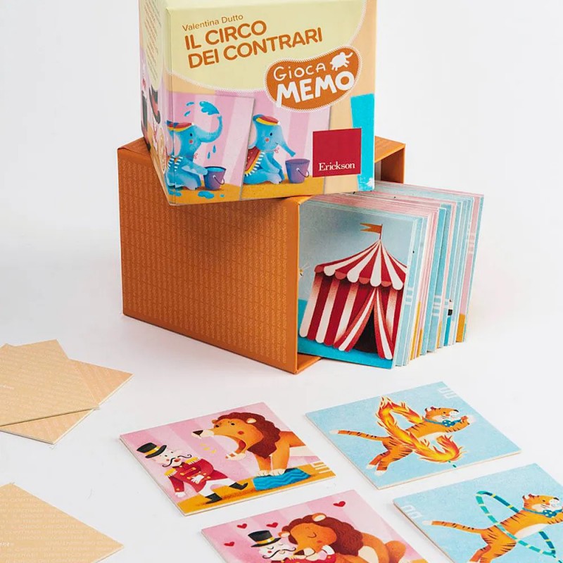 Giocamemo - Il circo dei contrari contiene 50 tessere di diversa difficoltà, da mescolare, disporre a faccia in giù e associare a coppie per sviluppare le abilità logiche.