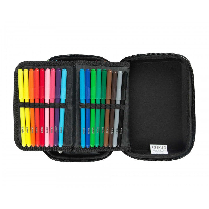AMPIO E COMPLETO: L'astuccio è ampio ed è completo di tutta la cancelleria necessaria per la scuola. Include due penne cancellabili Comix (blu e rossa), matita, gomma, righello, temperino e forbici con punta arrotondata, 18 matite e 18 pennarelli a punta fine Comix
