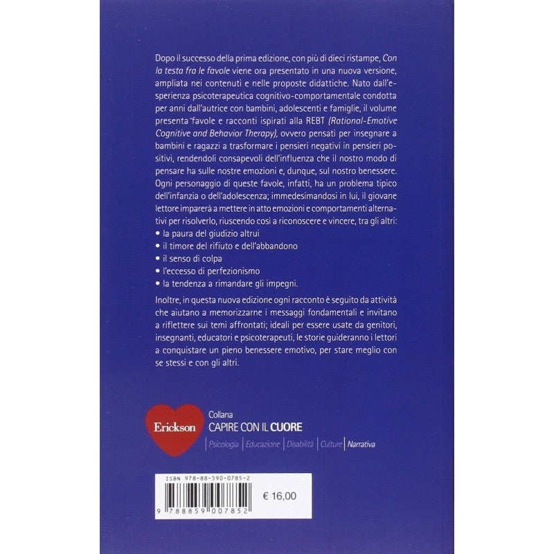 - "Con la testa fra le favole" viene ora presentato in una nuova versione, ampliata nei contenuti e nelle proposte didattiche. Nato dall'esperienza psicoterapeutica cognitivo-comportamentale condotta per anni dall'autrice con bambini, adolescenti e famiglie, il volume presenta favole e racconti ispirati alla REBT (Rational-Emotive Cognitive and Behavior Therapy), ovvero pensati per insegnare a bambini e ragazzi a trasformare i pensieri negativi in pensieri positivi, rendendoli consapevoli dell'influenza che il nostro modo di pensare ha sulle nostre emozioni e, dunque, sul nostro benessere. Ogni personaggio di queste favole, infatti, ha un problema tipico dell'infanzia o dell'adolescenza; immedesimandosi in lui, il giovane lettore imparerà a mettere in atto emozioni e comportamenti alternativi per risolverlo, riuscendo così a riconoscere e vincere, tra gli altri: la paura del giudizio altrui; il timore del rifiuto e dell'abbandono; il senso di colpa; l'eccesso di perfezionismo o la tendenza a rimandare gli impegni. Inoltre, in questa nuova edizione ogni racconto è seguito da attività che aiutano a memorizzarne i messaggi fondamentali e invitano a riflettere sui temi affrontati; ideali per essere usate da genitori, insegnanti, educatori e psicoterapeuti, le storie guideranno i lettori a conquistare un pieno benessere emotivo, per stare meglio con se stessi e con gli altri.