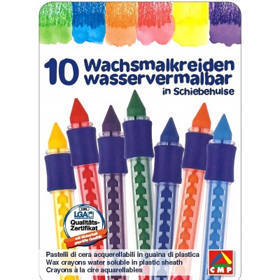 Pastelli a cera acquerellabili, con grip ergonomica, 10 colori. Colore a base di cere, cera d'api e pigmenti, coprente e di intenso effetto cromatico. Facile e scorrevole da usare grazie alla guaina in plastica. Può essere sfumato con uno stoppino umido o "acquerellato" con il pennello e l'aggiunta d'acqua, per effetti trasparenti e toni delicati. Si applica su carte e cartoncini bianchi o colorati, meglio se leggermente ruvidi, su tele e cartoni telati ed anche tessuti compatti quali il cotone.