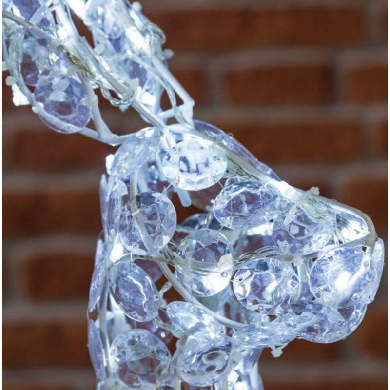Questa renna alta 90 cm è illuminata da ben 200 led di colore bianco per un eccezionale effetto di luminosità e brillantezza. La luce si riflette in cristalli acrilici tridimensionali che ne permettono una diffusione particolarmente suggestiva ed elegante.