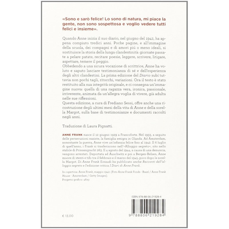 Il "Diario" della ragazzina ebrea che a tredici anni racconta gli orrori del Nazismo torna in una nuova edizione integrale, curata da Otto Frank e Mirjam Pressler, e nella versione italiana da Frediano Sessi, con la traduzione di Laura Pignatti e la prefazione dell'edizione del 1964 di Natalia Ginzburg. Frediano Sessi ricostruisce in appendice gli ultimi mesi della vita di Anna e della sorella Margot, sulla base delle testimonianze e documenti raccolti in questi anni.