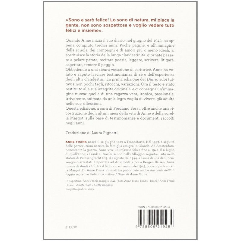 Il "Diario" della ragazzina ebrea che a tredici anni racconta gli orrori del Nazismo torna in una nuova edizione integrale, curata da Otto Frank e Mirjam Pressler, e nella versione italiana da Frediano Sessi, con la traduzione di Laura Pignatti e la prefazione dell'edizione del 1964 di Natalia Ginzburg. Frediano Sessi ricostruisce in appendice gli ultimi mesi della vita di Anna e della sorella Margot, sulla base delle testimonianze e documenti raccolti in questi anni.