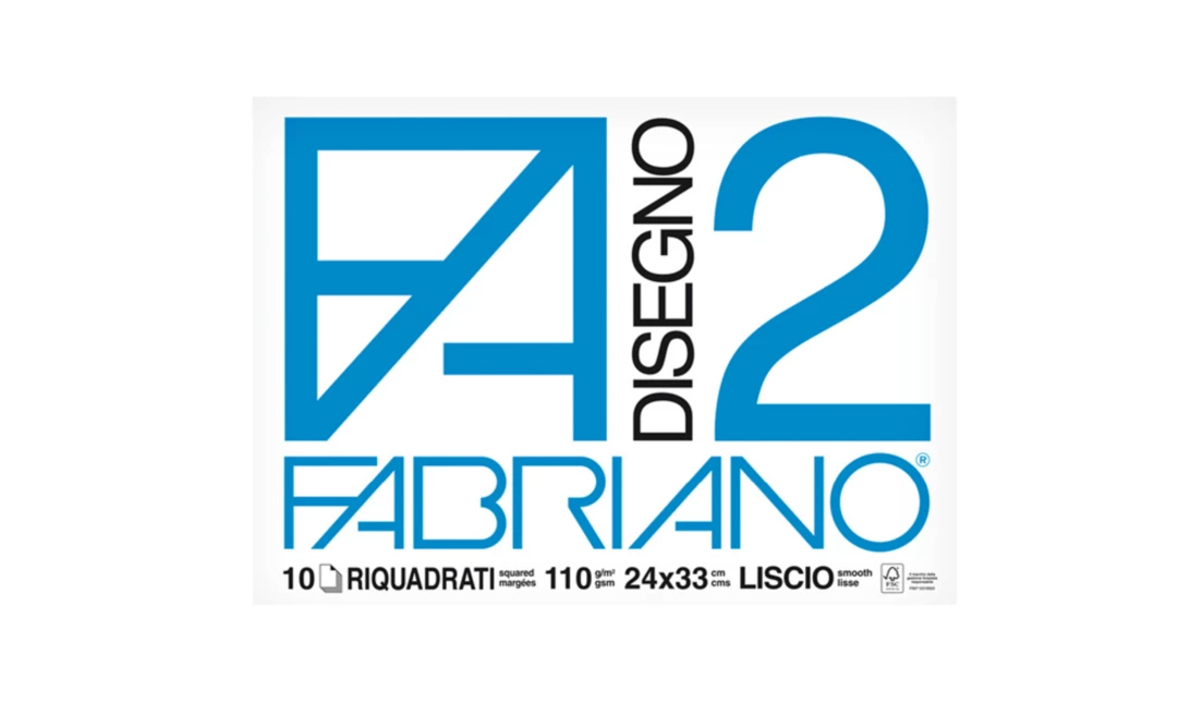 Album da disegno Fabriano F2, 24 x 33 cm, con 10 fogli lisci riquadrati da 110 g/m², perfetto per schizzi, disegni tecnici e lavori creativi di precisione.