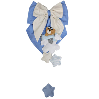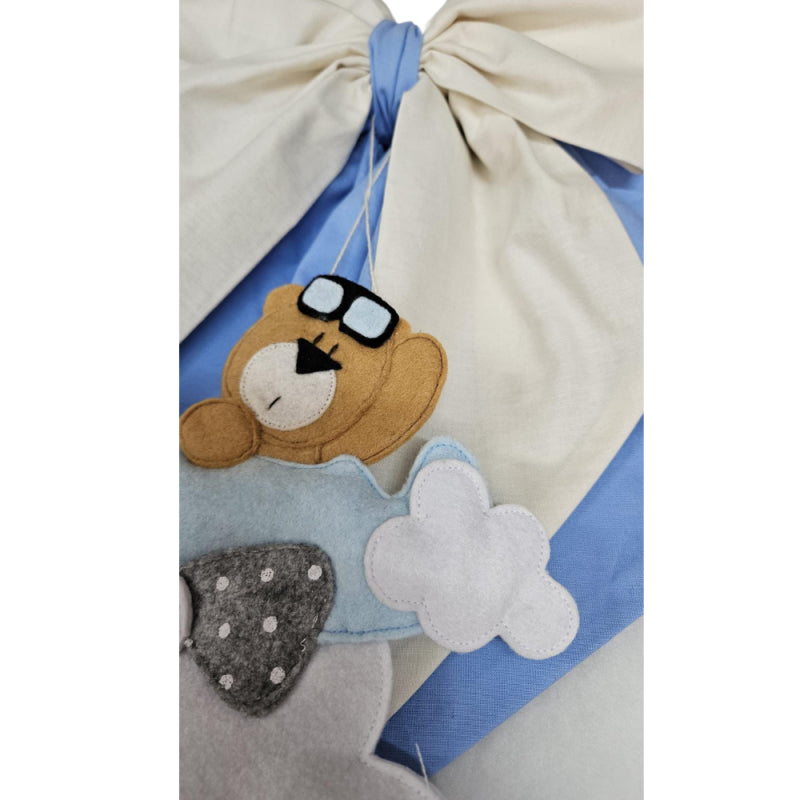 - Decorazioni cuciti a mano: orsacchiotto su aeroplano e nuvolette in in pannolenci + tre stelline in cotone