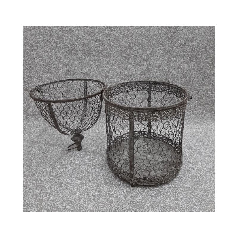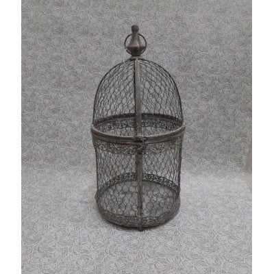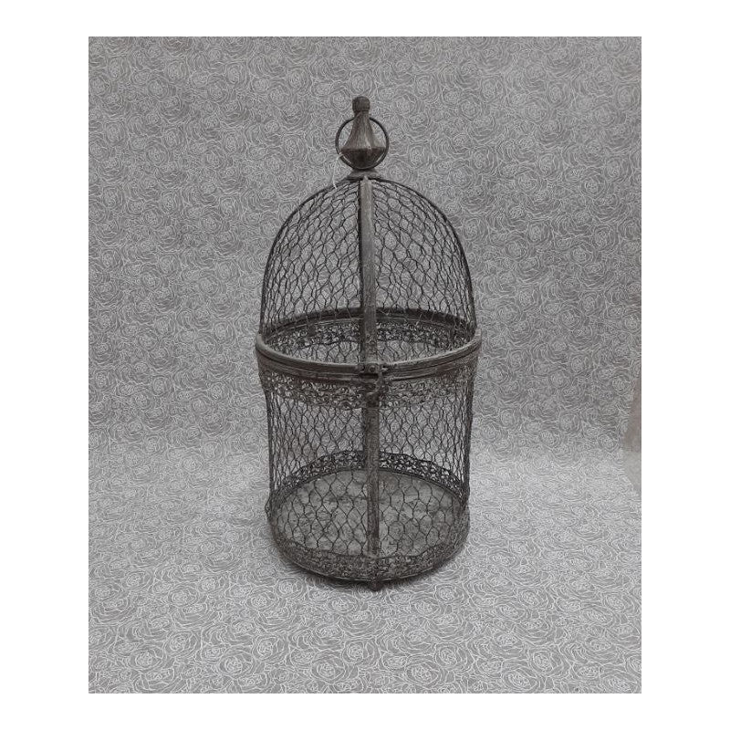 Gabbia tonda in metallo. Colore: grigio. Con parte superiore apribile e dotata di un gancio per essere appesa.