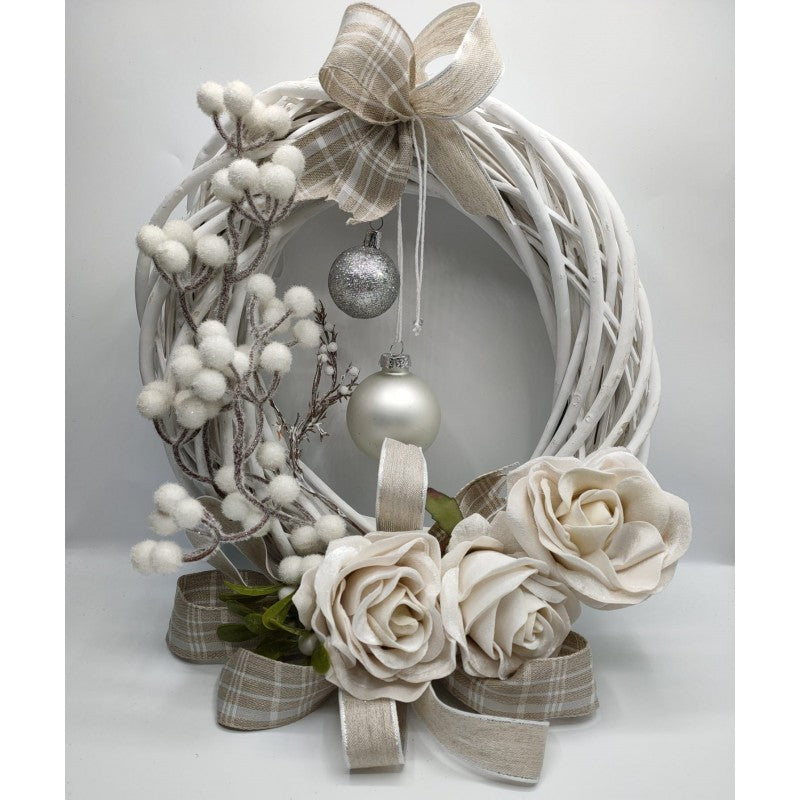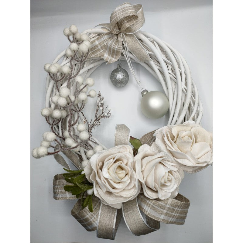 Ghirlanda di Natale con rose di velluto bianche e bacche bianche