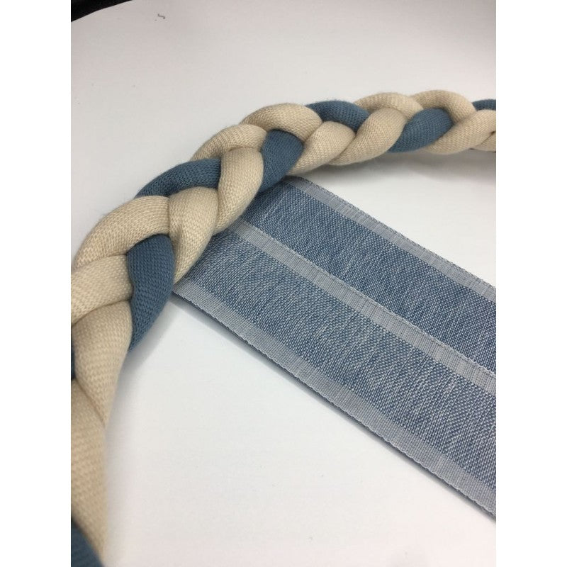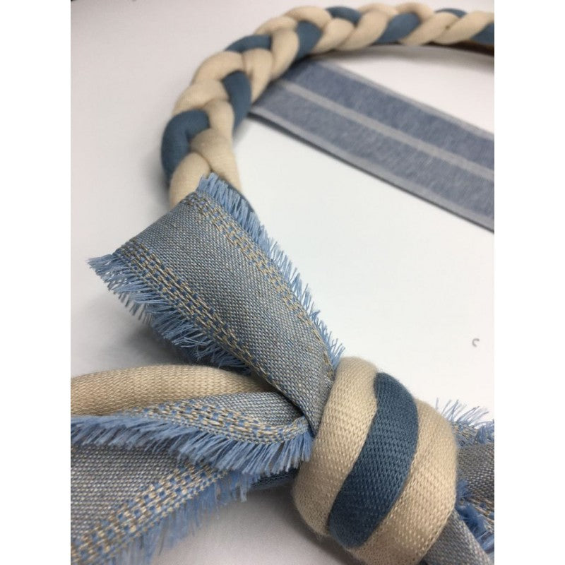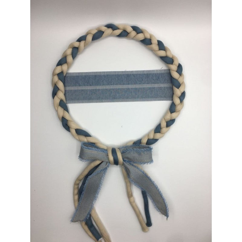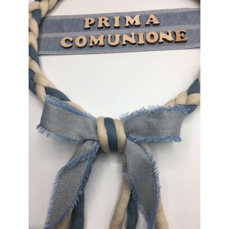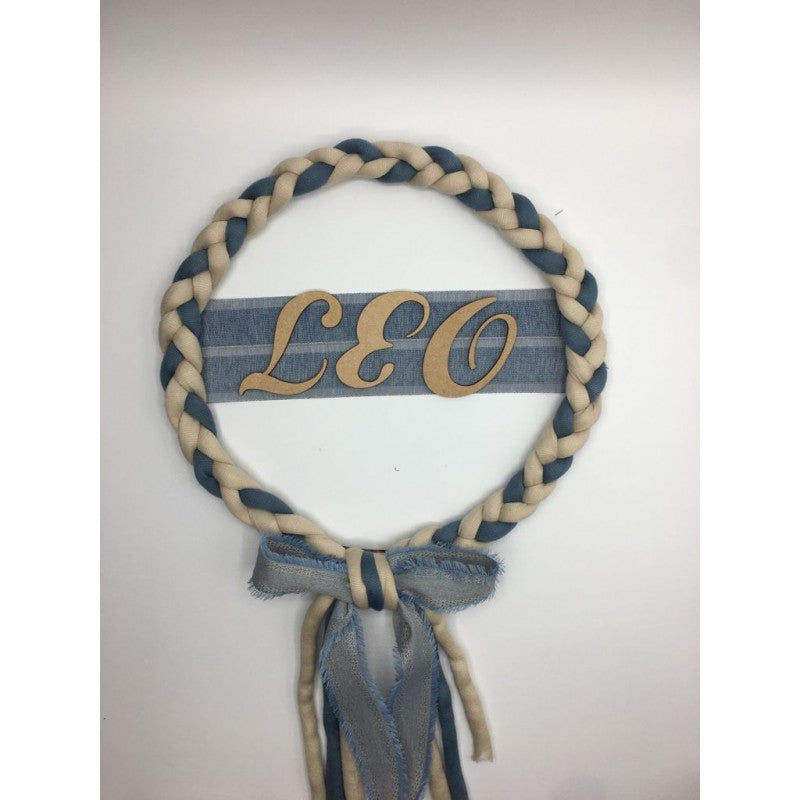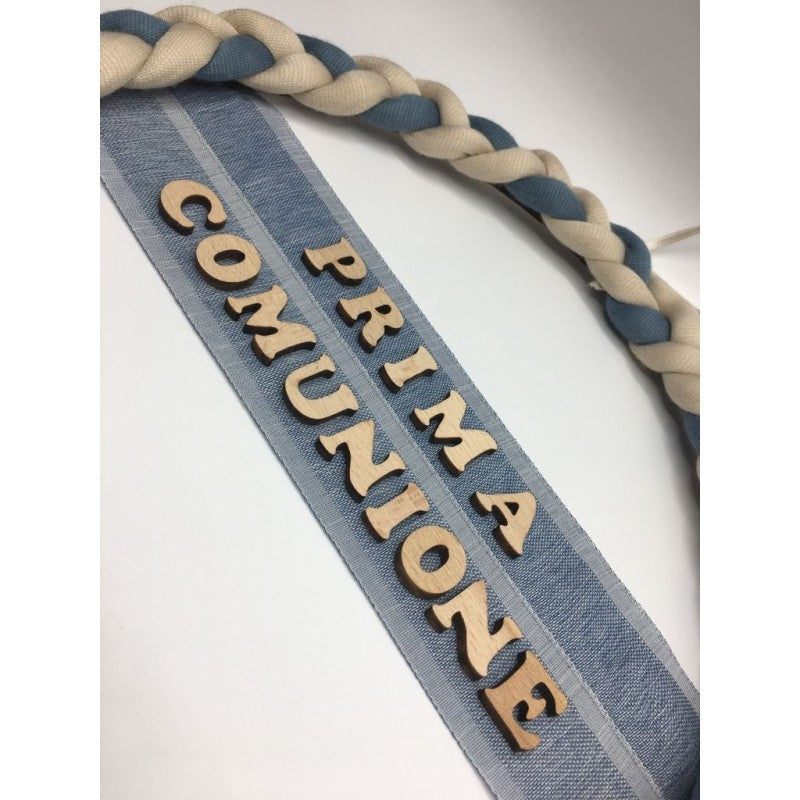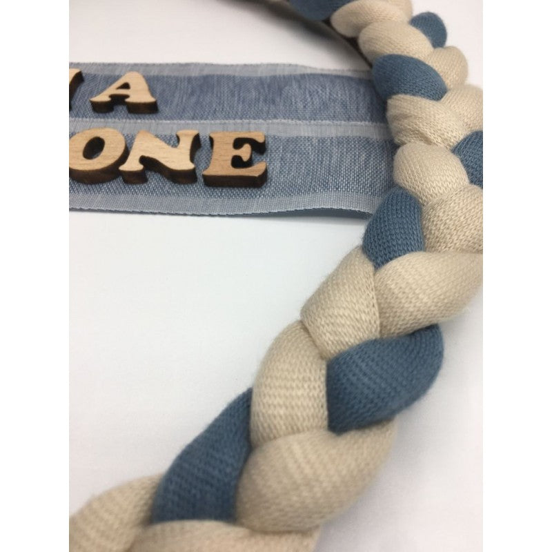 realizzata interamente a mano, con nastri, lettere in legno e cordone morbido.