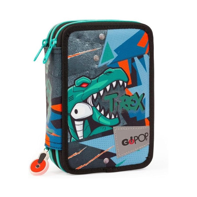 - Astuccio triplo Gopop T-Rex, 3 scomparti e 3 zip.