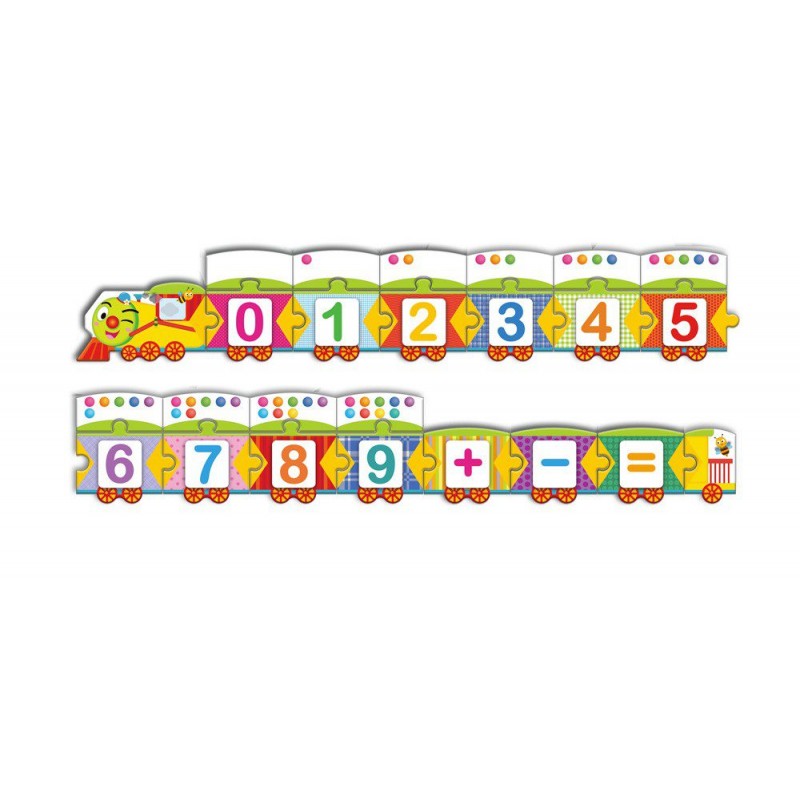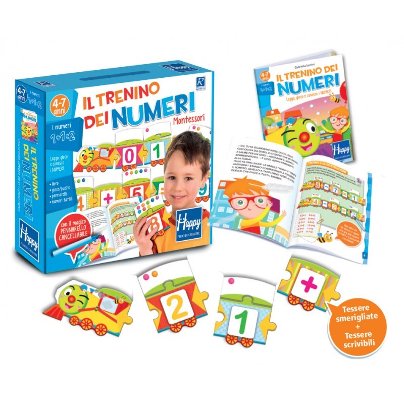 Contenuto: 1 libro, 1 pennarello con cancellino, 1 tessera locomotiva, 1 tessera vagone di coda, 10 vagoni con numeri da 0 a 9 in rilievo, 10 tessere “quantità” con palline da 0 a 9 in rilievo, 10 vagoni bianchi scrivibili, 10 tessere “quantità” senza palline, 1 tessera segno +, 1 tessera segno -, 1 tessere segno =.
