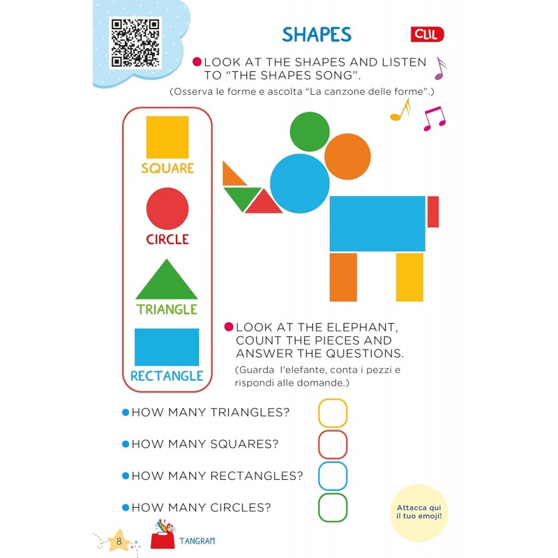 In tutte le pagine è presente un QR CODE che consente di attivare l'audio per ascoltare allegre canzoni e la corretta pronuncia di parole e frasi in inglese.