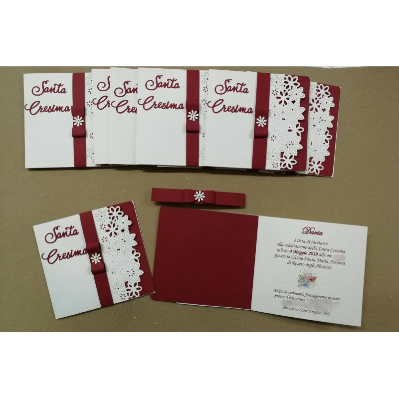 Invito personalizzabile a libro realizzato in cartoncino fustellato (motivo floreale) con rinforzo in cartoncino con chiusura a fascia in cartoncino.