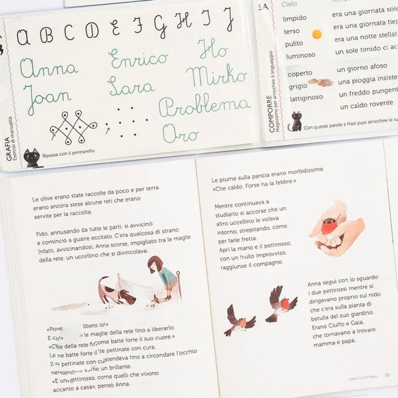 Cofanetto con: 8 strisce, portastrisce, libro “20 storie + Luna”, quaderno, pennarello, guida per insegnanti