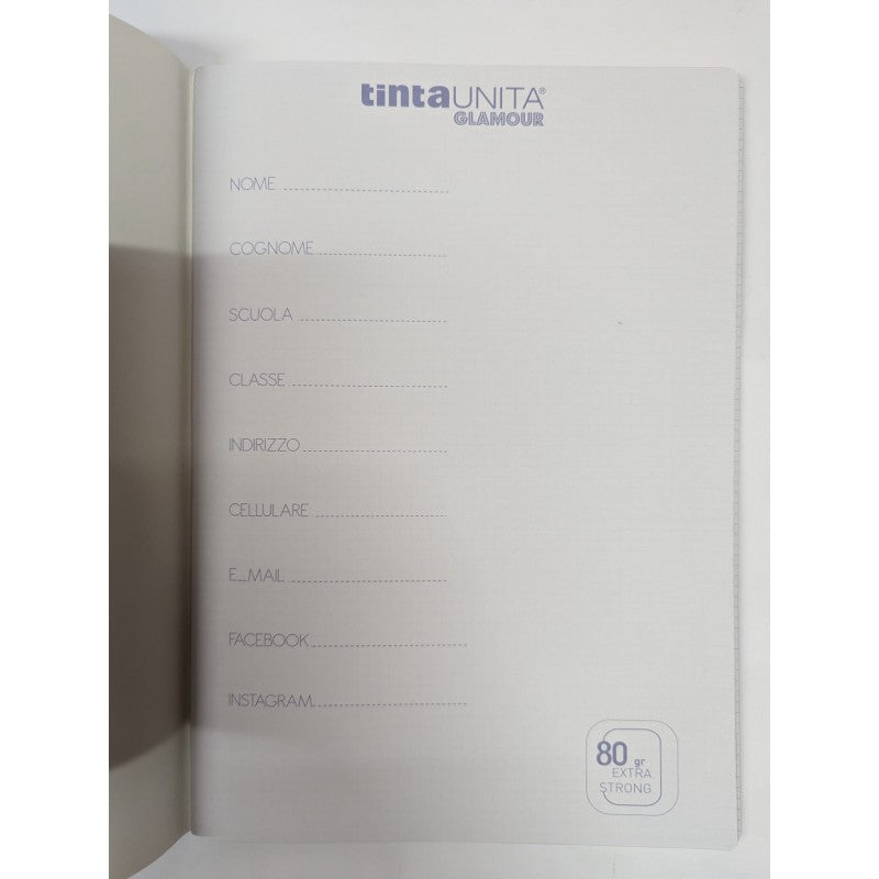 Quaderno a punto metallico Tinta Unita Glamour, 80 paginein carta da 80g/mq, copertina tinta unita glitter in 4 varianti. A quadretti 4mm, formato A4 21x30cm.