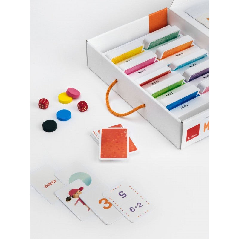 La Valigetta di matematica della Maestra Larissa comprende 10 mazzi di carte, ciascuno composto da 55 carte, due tabelloni con dadi e pedine per realizzare oltre 30 attività che coprono gli obiettivi didattici più importanti dell’ambito matematico per le classi prima e seconda della scuola primaria.