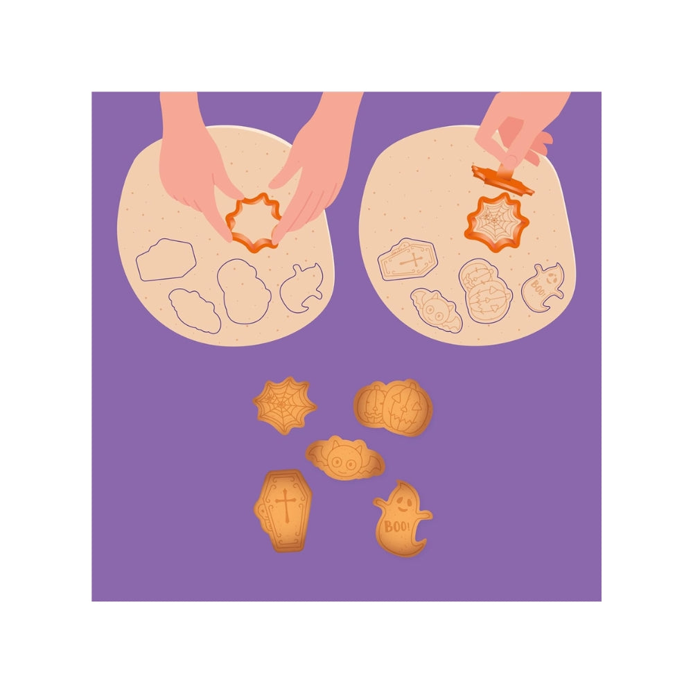 Perfette per creare dolcetti divertenti e spettrali, queste 5 formine a tema Halloween ti permettono di realizzare biscotti con dettagli precisi e originali grazie al pratico timbro incluso.