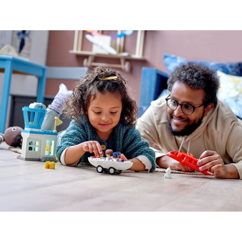 Il set "Aereo e aeroporto" LEGO DUPLO (10961) include 3 personaggi DUPLO®, un papà, una bambina e un pilota, un aeroplano con tetto rimovibile e una torre di controllo girevole con scivolo per i bagagli. Inoltre, sono inclusi divertenti accessori come un orsacchiotto, una bandiera e una valigia apribile, che aggiungono un tocco di realismo in più al gioco di ruolo del viaggio in aereo.