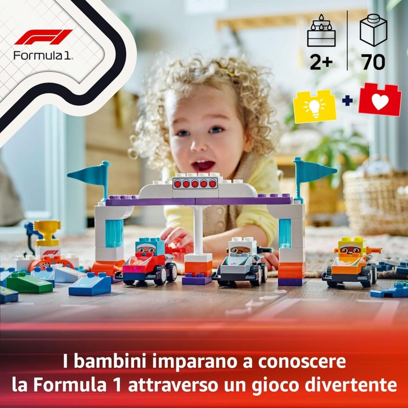 Macchina giocattolo F1 da costruire per bambini e bambine da 2 anni: il set di giochi didattici LEGO DUPLO Auto da Corsa e Piloti Team F1, porta il tuo giovane pilota nel mondo della Formula 1 e del divertimento delle corse con le macchine