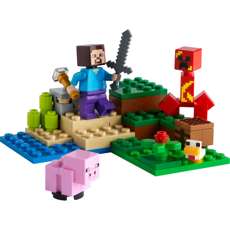 Questo set compatto racchiude tutto il fascino del mondo Minecraft: Steve , l'eroe leggendario, pronto a combattere contro il temibile Creeper™ esplodente rosso . Ma non è solo battaglia! Un simpatico maialino e un tenero pulcino aggiungono una nota di dolcezza all'avventura.