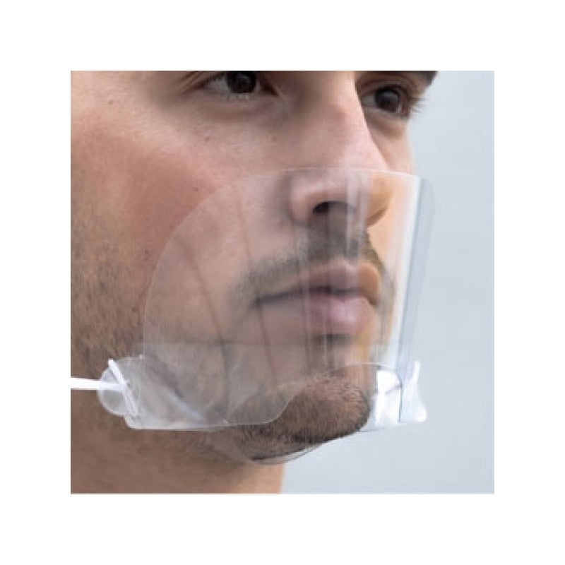 Mascherina protettiva per bocca e naso in materiale pet, con regolazione elastica per la testa.