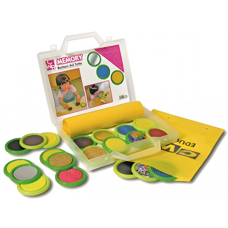 La versione “tattile” di un famoso gioco di memoria: grazie a questi bottoni, rivestiti con differenti materiali (cartone ondulato, gomma, sughero ecc.), il bambino potrà sviluppare contemporaneamente le capacità tattili, mnemoniche e discriminatorie. Nel set troverete anche un sacchetto nel quale è possibile nascondere i bottoni; il bambino dovrà infilare una mano nel sacchettino, estrarre un bottone e cercare di trovare un altro bottone uguale al primo semplicemente toccando quelli che sono ancora nel sacchetto.