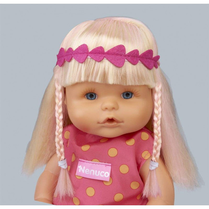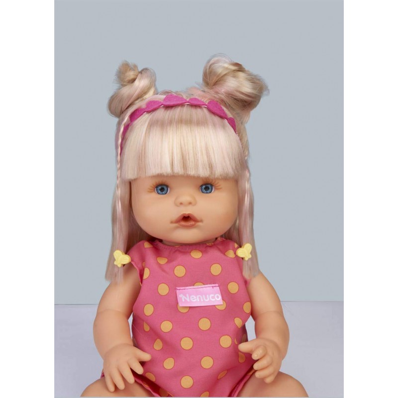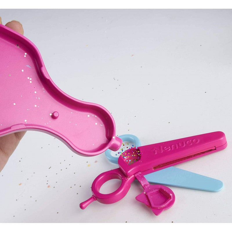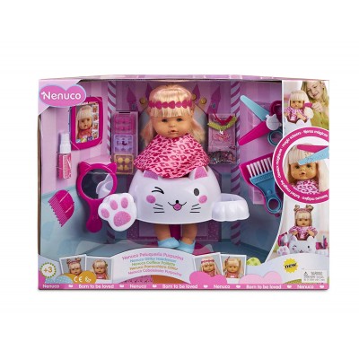 Nenuco parrucchiera Glitter è scintillante. Siede nella poltrona a forma di gattino come nei veri saloni dei parrucchieri e con il suo tablet potrà vedere la sua serie preferita mentre si fa divertenti acconciature. Ha dei belli capelli lunghi biondi con riflessi rosa. Include delle forbici magiche che riempiono i capelli di glitter, molti accessori come spray per capelli, pettine, scopettino e dei cassetti per poterli riporre.