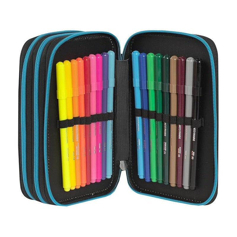 - AMPIO E COMPLETO: L'astuccio è ampio ed è completo di tutta la cancelleria necessaria per la scuola. Include 18 pennarelli, 18 matite colorate, matita, gomma, penna cancellabile blu Frixion, penna rossa, righello, temperino con serbatoio, forbici con punta arrotondata, squadra ed etichette portanome