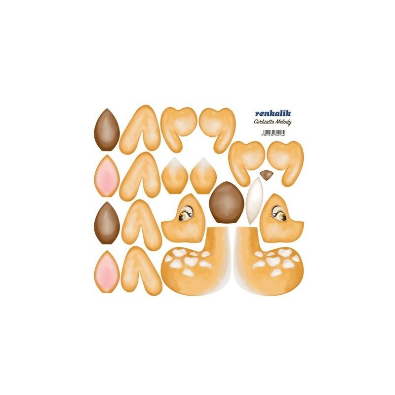 Il pannello che misura 50 x 50 cm è già stampato e colorato con i vari componenti sulla stoffa del corpo con zampe faccia del pupazzo cerbiatto Melody.