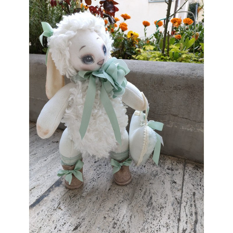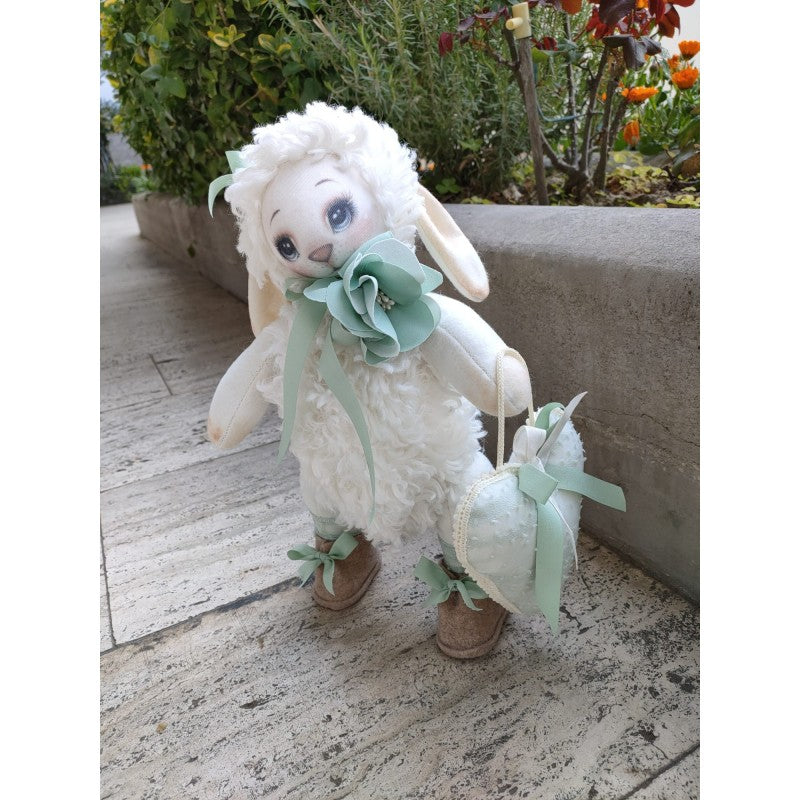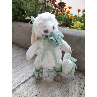 La Pecorella Belinda è realizzata interamente a mano, in tessuto e decorata con nastri.