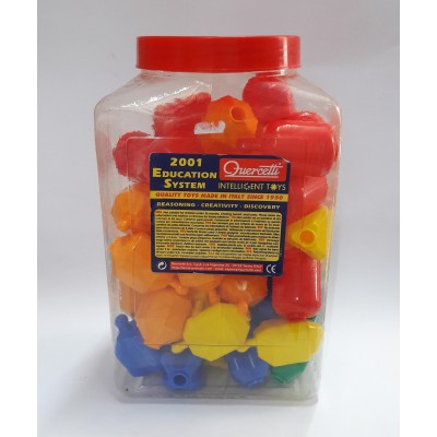 Grandi elementi leggerissimi di quattro forme diverse e piacevoli da maneggiare, si incastrano facilmente tra di loro per realizzare lunghe collane in sequenze sempre diverse. Sicura, lavabile, perfettamente adatta alle esigenze di crescita dei più piccoli, non fa rumore quando cade. Il barattolo contiene 46 pezzi.