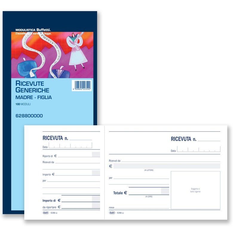 Ricevute Generiche di denaro, Madre - Figlia - Blocco 100 fogli - 2 tagliandi - 10x21,5 cm
