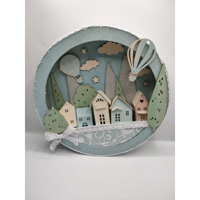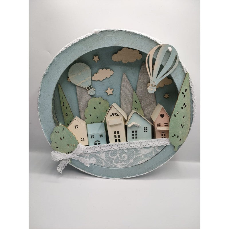 Piccolo villaggio in legno decorato a mano con colori acrilici, luci led, tessuti e nastri.