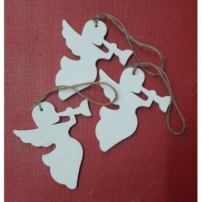 Sagome in legno decorative: angioletti (colore bianco). Dotate di cordino per poterle appendere. La confezione contiene 3 figure da 9,5x9 cm circa. Spessore 6 mm.