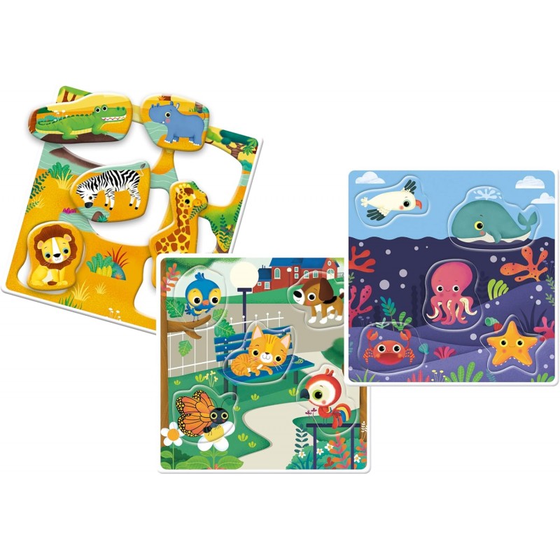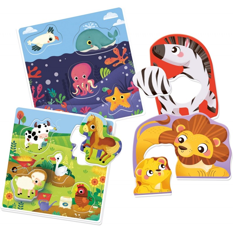 - Tessere Sagomate Mamme Cuccioli: Impara a riconoscere gli animali e le loro famiglie con coppie di sagome da incastrare. Un gioco divertente per sviluppare il senso logico e la coordinazione occhio-mano.