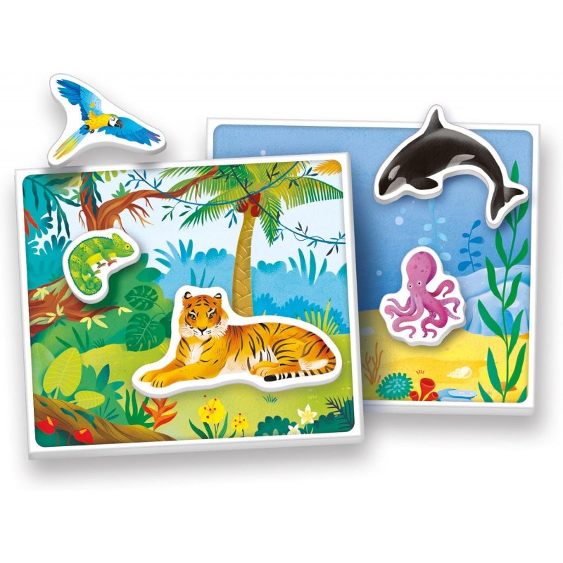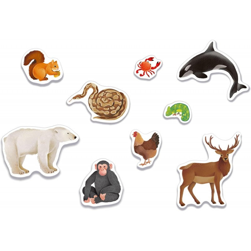 - Tabelloni-ambiente: Scenari accattivanti come la savana, la foresta o la fattoria permettono ai bambini di collocare gli animali sagomati nel loro habitat naturale.