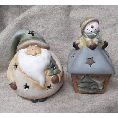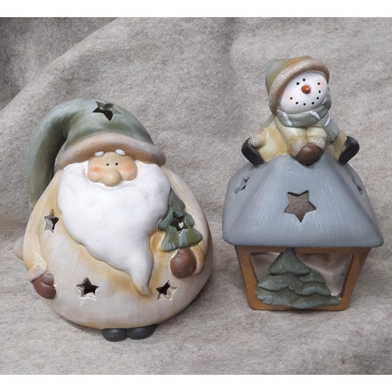 Paralumi natalizi nelle tonalità pastello. Due soggetti: Babbo Natale e Lanterna con pupazzo di neve. Altezza: 15/16 cm circa.