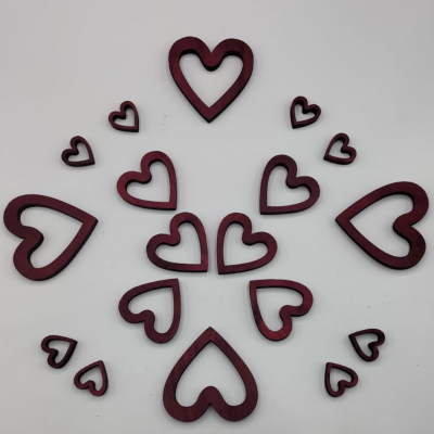 Sagome in legno decorative: cuore vuoto all'interno (colore rosso). La confezione di 18 pezzi contiene: 4 figure da 7 cm, 6 figure da 4,8 cm, 8 figure da 2,4 cm (altezza). Spessore 7 mm.