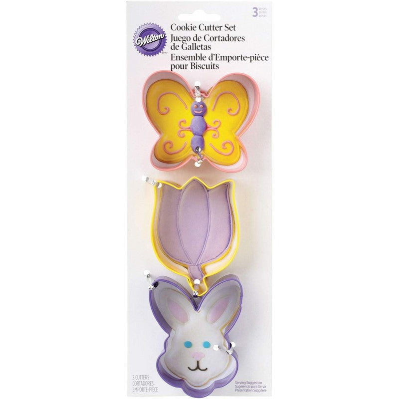 Set di tre tagliapasta in metallo colorato composto da: fiore, coniglio, farfalla. Ideale per la realizzazione di stupendi Biscotti.