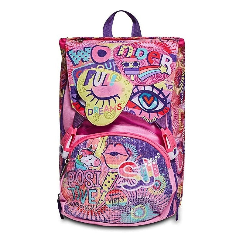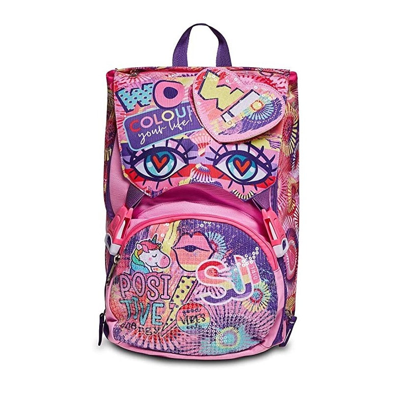 - TASCHE: Tasca frontale. Tasca su pattina.. ALTRE CARATTERISTICHE: Zaino doppio scomparto estensibile tramite zip laterali. Flip System su pattina a due movimenti con Mini Flip con paillettes.
