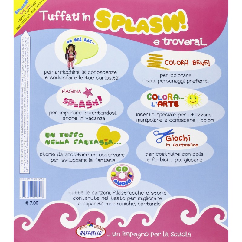 Inoltre la presenza nel progetto “Splash!” di storie, filastrocche e canzoni inedite nel Cd Audio permette di trascorrere in allegria le vacanze, non dimenticando di mantenere in allenamento le proprie capacità cognitive, rendendo il prodotto estremamente innovativo e vicino alla realtà del bambino.