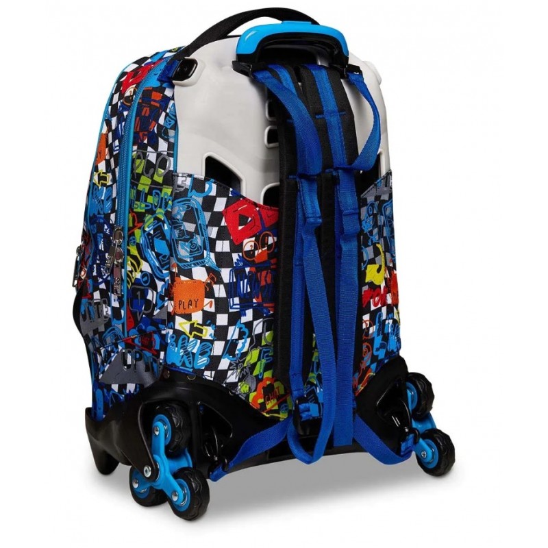 In poche semplici mosse da trolley divento zaino e viceversa. Il mio carrello ha fondo rinforzato e protezioni angolari per dare stabilità al trolley e protezione al contenuto. Lo sganci e divento uno zaino lavabile, maxi capiente, dotato di tasca frontale e comodo da indossare grazie a schienale e spallacci imbottiti e rivestiti in tessuto. Spallacci che, se mi usi come trolley, possono essere a scomparsa sollevarsi automaticamente tirando su la resistente doppia barra telescopica.