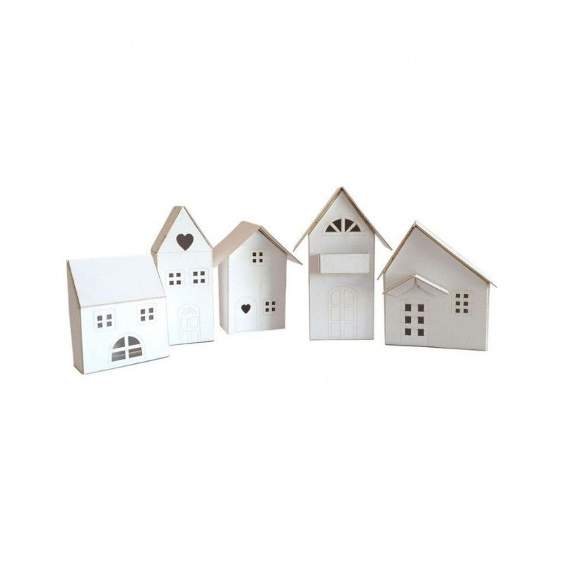 Confezione da 1 foglio di cartone vegetale pretagliato (da piegare ed incollare) per realizzare 5 casette in varie forme e dimensioni.